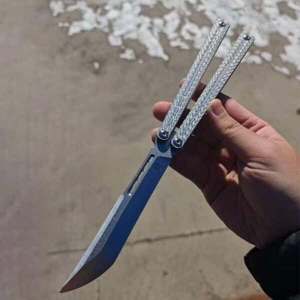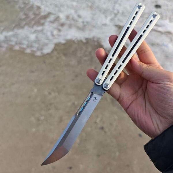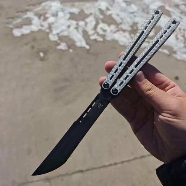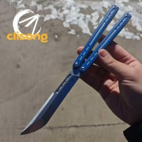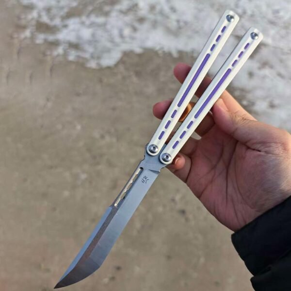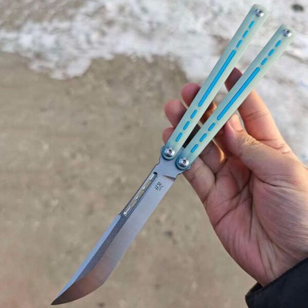 This balisong features a sleek channel-style design with a built-in titanium frame and liners, weighing only 115 grams. It delivers exceptional durability while maintaining a lightweight, high-performance feel. The unsharpened false edge ensures safety during practice, while the advanced structural design provides outstanding balance and unparalleled control, allowing you to perform complex tricks with ease.